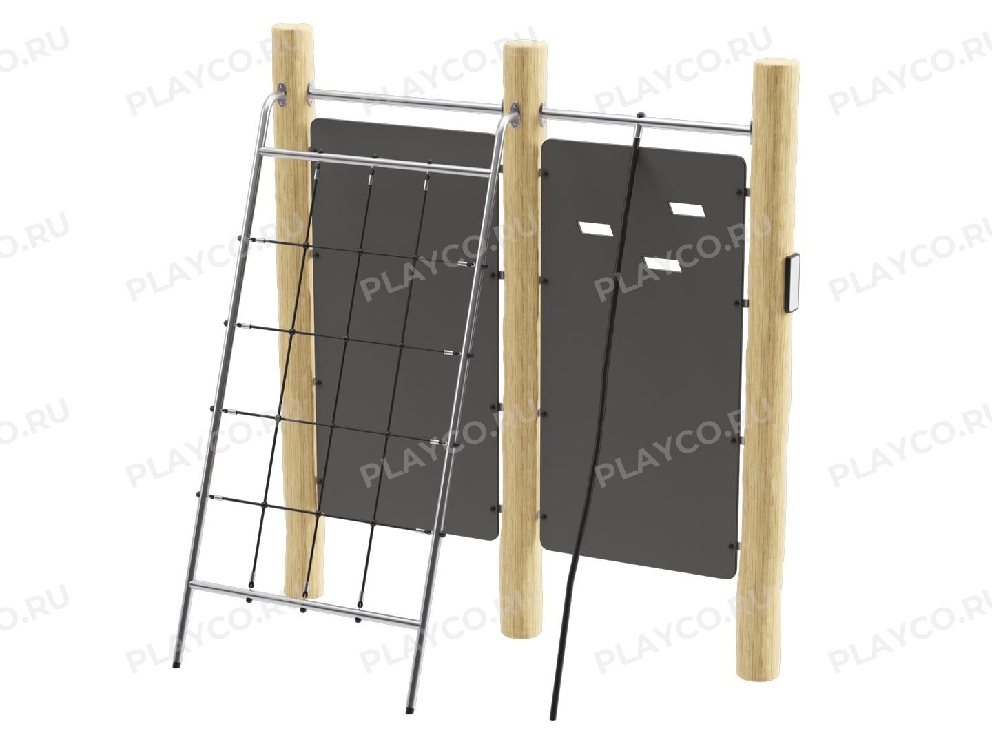 Конструкция выполнена из натурального дерева (лиственница, ель или акация — на выбор) с гладкой обработкой и защитным покрытием для уличной эксплуатации. Комплекс включает канатную сетку для лазания, наклонную лестницу и стенки из HPL-панелей, предназначенные для выполнения стойки на руках и других функциональных упражнений. Прочные деревянные основания обеспечивают устойчивость и надежность всей конструкции.