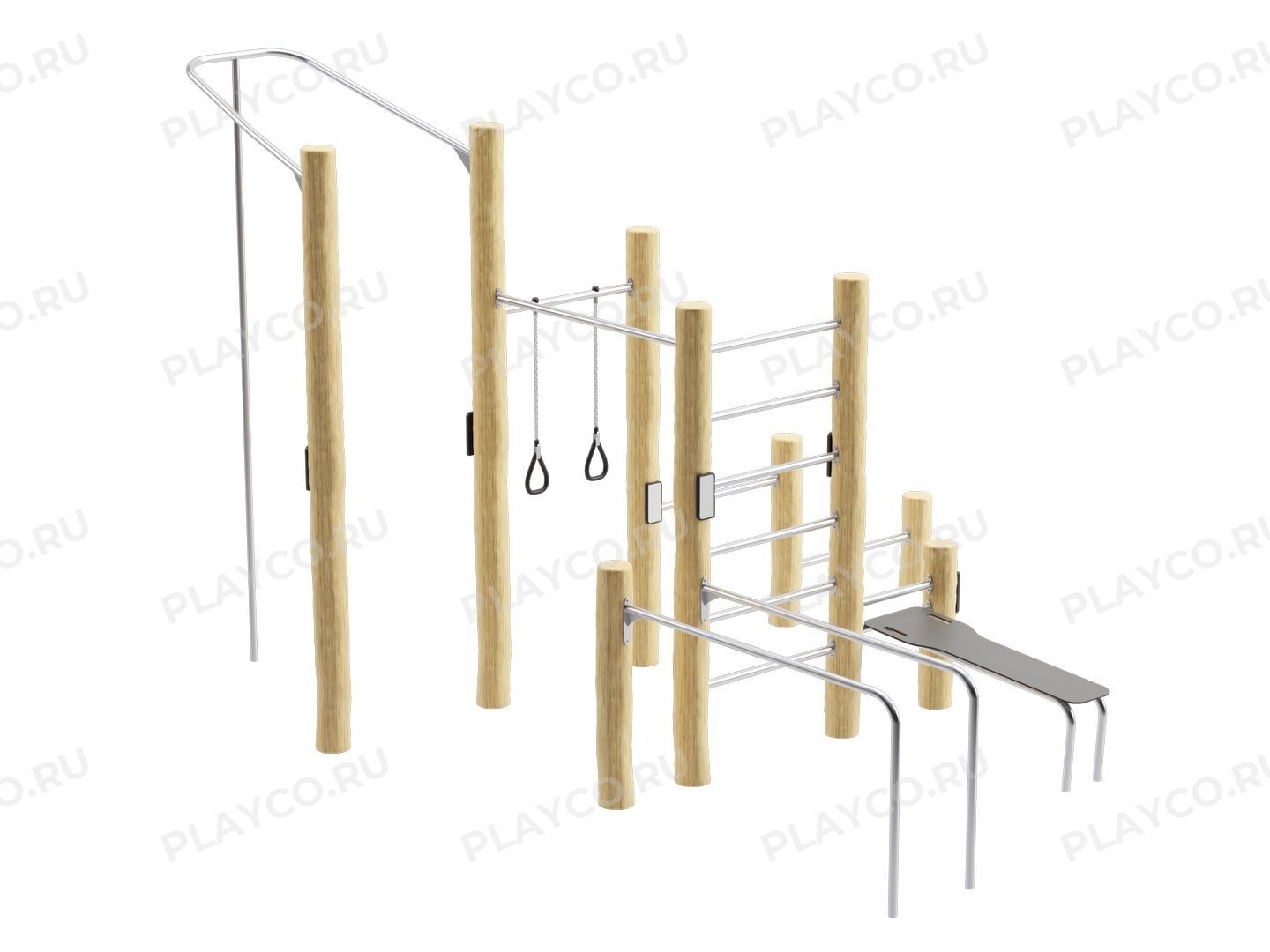 Просторный воркаут-комплекс на деревянных стойках серии Play Eco — многофункциональная спортивная зона для силовых, координационных и функциональных тренировок, подходит детям, подросткам и взрослым с разным уровнем подготовки.