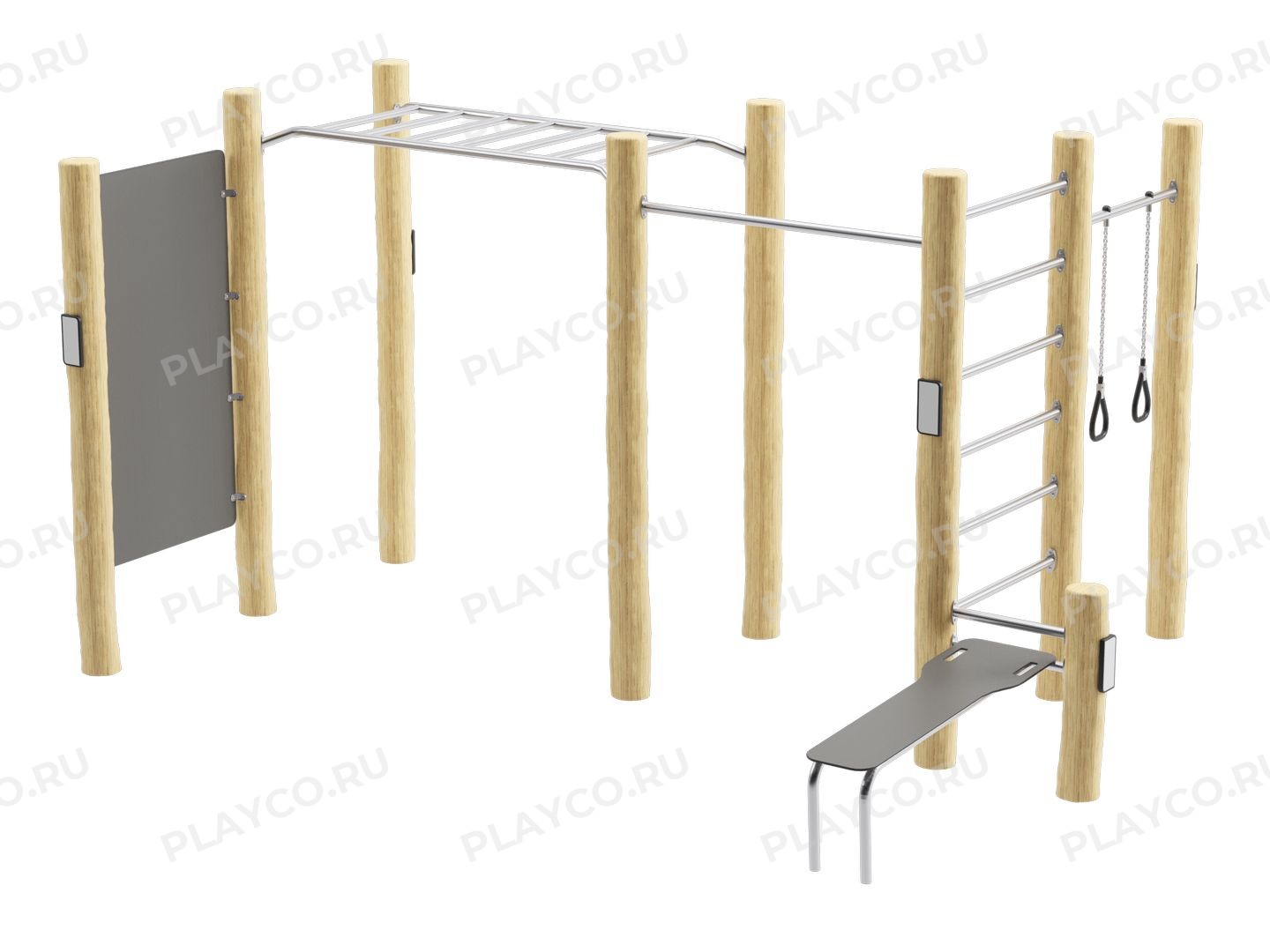 Многофункциональный воркаут-комплекс на деревянных стойках серии Play Eco — универсальное решение для силовых, функциональных и координационных тренировок, подходит детям, подросткам и взрослым с разным уровнем подготовки.