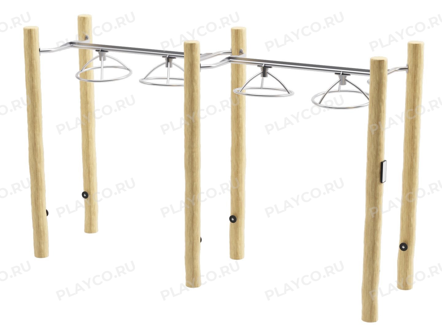 Конструкция выполнена из натурального дерева (лиственница, ель или акация — на выбор) с гладкой обработкой и защитным покрытием для эксплуатации на открытом воздухе. Прочные деревянные стойки соединены перекладинами из нержавеющей стали, на которых размещены вращающиеся рукояти, усложняющие выполнение упражнений и повышающие тренировочный эффект.