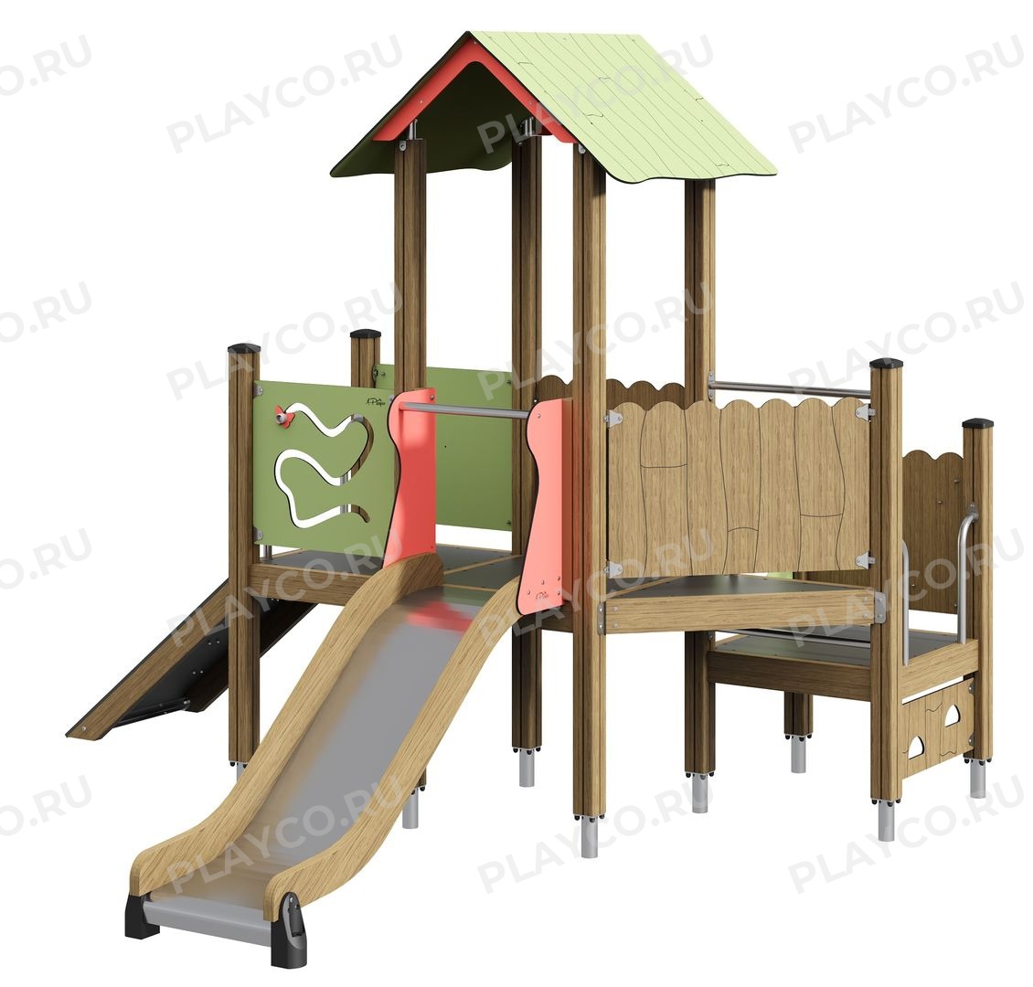 Развить координацию и силы поможет наклонный трап с удобными зацепами. Высокая горка с плавным изгибом и высокими бортиками гарантируют безопасный и увлекательный спуск.