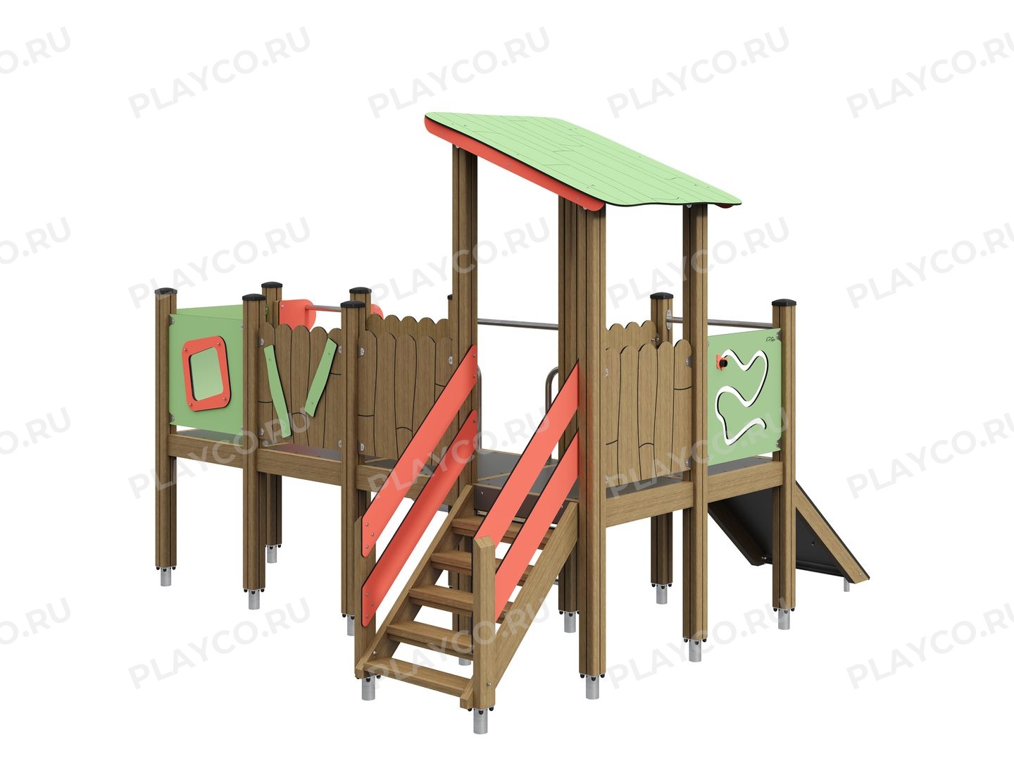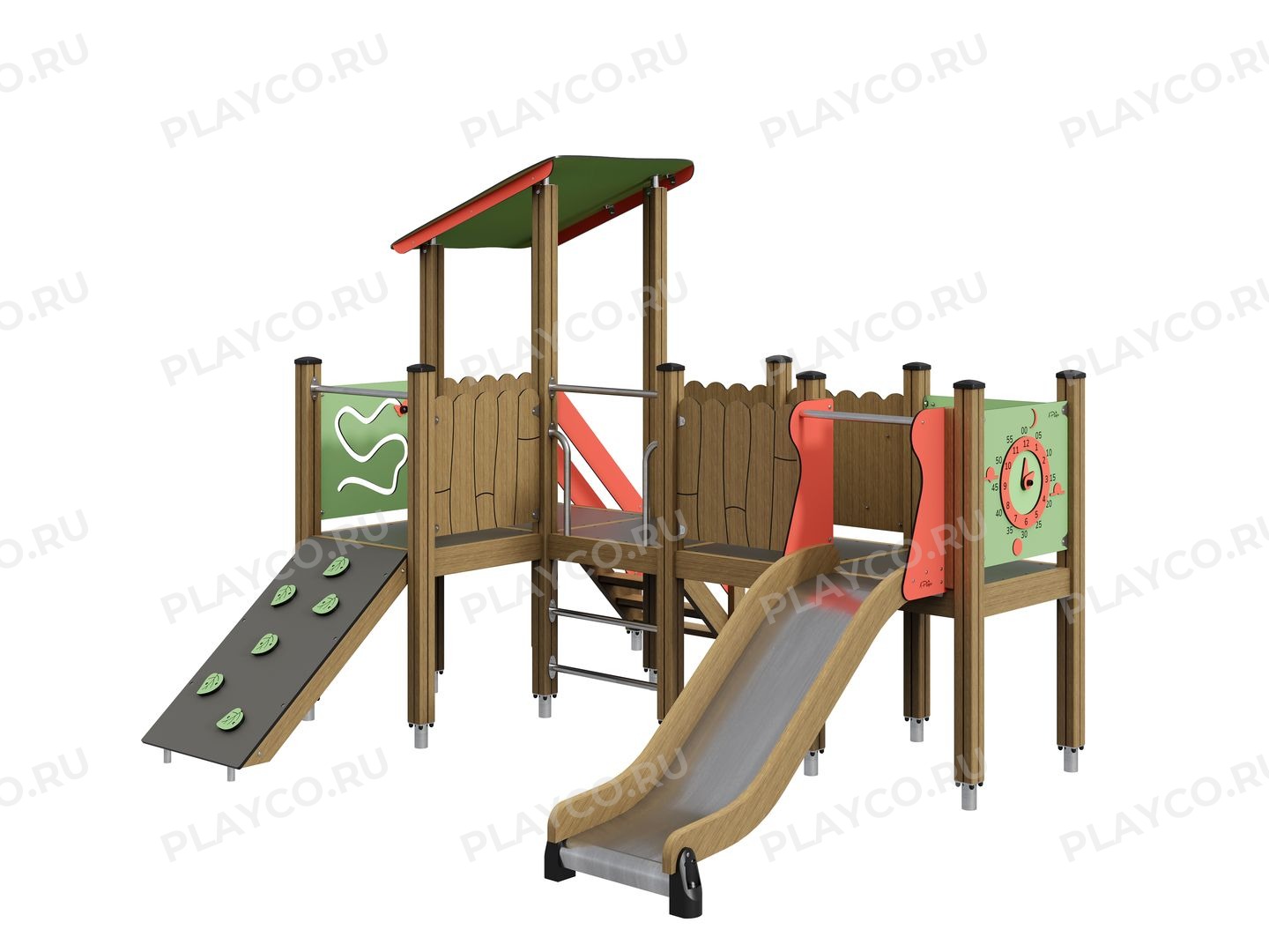 Комплекс серии Fun Forest предназначен для детей от 7 лет. Конструкция выполнена из клееного бруса и прочных HPL-панелей. В комплекс входят две платформы на разных уровнях, соединённые подвесным мостиком, удобная лестница с поручнями, наклонный трап с эргономичными зацепами, а также длинная прямая горка из нержавеющей стали с высокими бортиками для безопасного спуска.