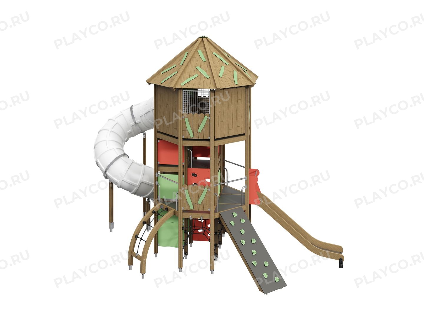 Огромный многоуровневый детский игровой комплекс серии Fun Forest предназначен для детей от 7 лет. Конструкция выполнена из нержавеющей стали, HPL-панелей и клееного бруса. Комплекс оснащён несколькими соединёнными платформами на разных уровнях. Закрытая спиральная горка-туннель сделана из качественного LLDPE-пластика, поэтому будет радовать маленьких исследователей долгие годы.
