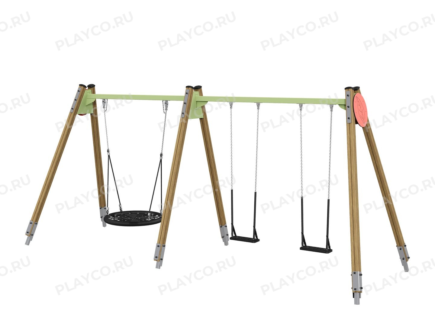 Качели серии Fun Forest предназначены для детей в возрасте от 3 лет. Конструкция выполнена из клееного бруса и HPL-панелей в качестве акцента. Качели оснащены сразу тремя подвесами: большим круглым сиденьем-«гнездом» из плетёных канатов, безопасным сиденьем-люлькой для самых маленьких и классическим плоским сиденьем для самостоятельного качания.
