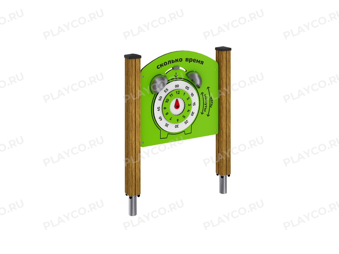 Игровая панель «Будильник» от Playco для детей от одного года. Она выполнена из прочных ярких HPL-панелей на надежных опорах. Панель учит определять время по аналоговым часам. На неё нанесены текстовые указатели со стрелками — «часы» и «минуты», которые помогают быстрее разобраться в устройстве циферблата.
