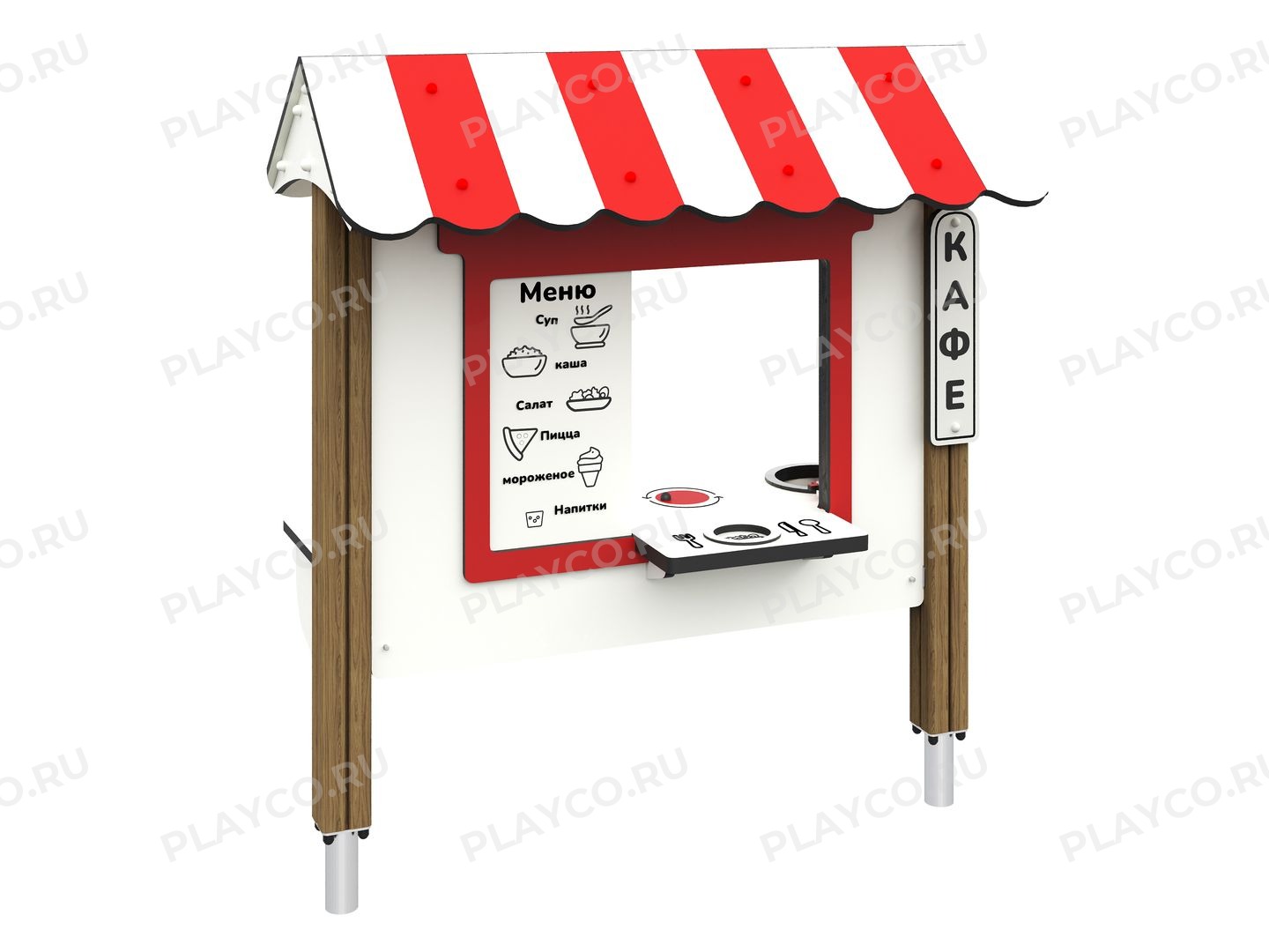 Игровая панель «Летнее кафе» от Playco для детей от одного года. Панель выполнена из прочных ярких HPL-панелей и надежных опор. Она имитирует уличный киоск или зону фудкорта. Панель идеально подходит для коллективных сюжетно-ролевых игр, обучая детей правилам этикета, основам счета и коммуникации в процессе «обслуживания клиентов».