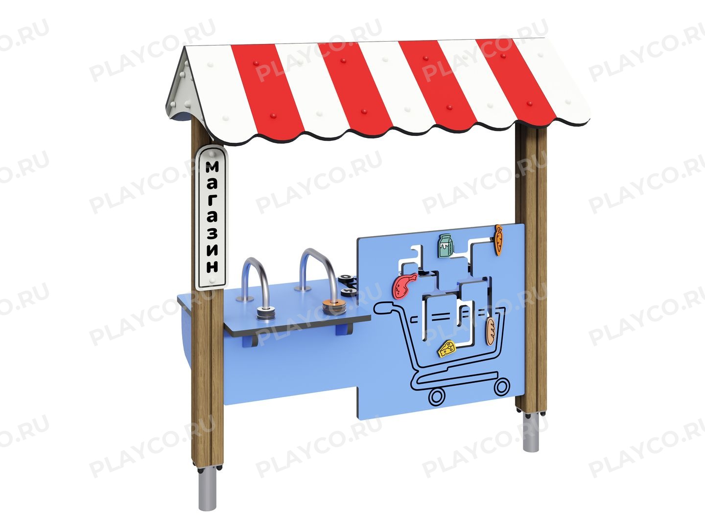 Игровая панель «Магазин» от Playco для детей от одного года. Панель выполнена из прочных ярких HPL-панелей и надежных опор из клееного бруса. анель вовлекает детей в активную сюжетную игру, развивая логику, мелкую моторику и навыки общения в процессе совершения «покупок».
