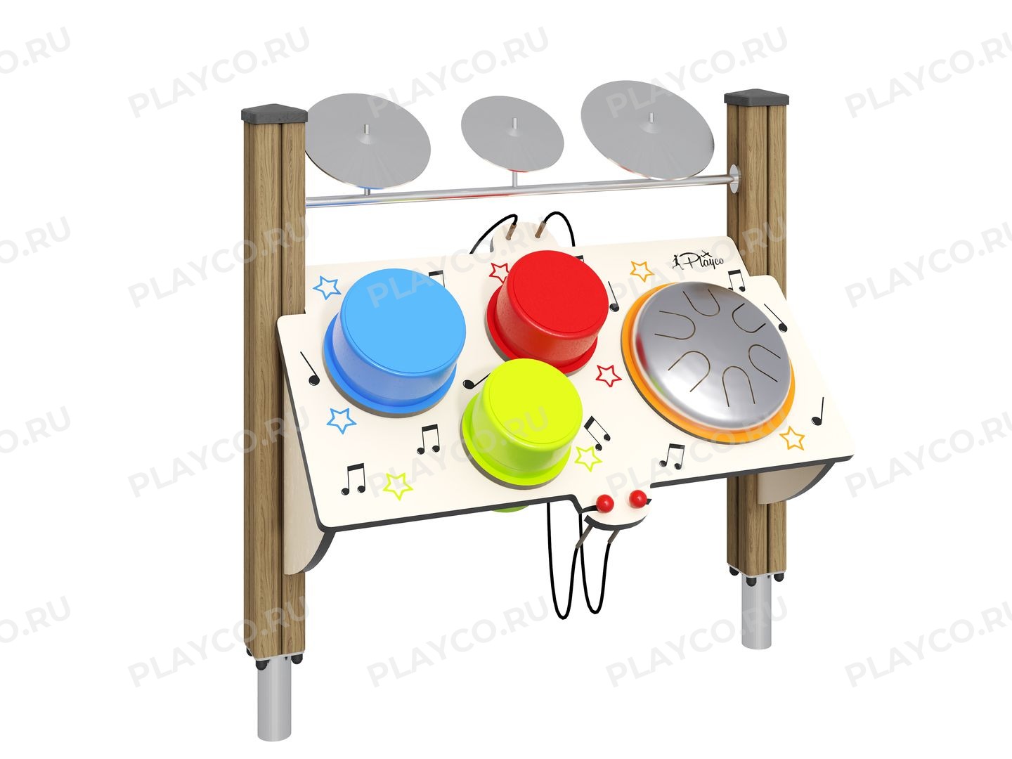Игровая панель «Ударные» от Playco для детей от одного года. Панель выполнена из прочных ярких HPL-панелей, металлических элементов и надежных опор. Она представляет собой полноценную ударную установку под открытым небом. Конструкция стимулирует чувство ритма, слуховое восприятие и социальные навыки, когда дети устраивают совместные выступления.