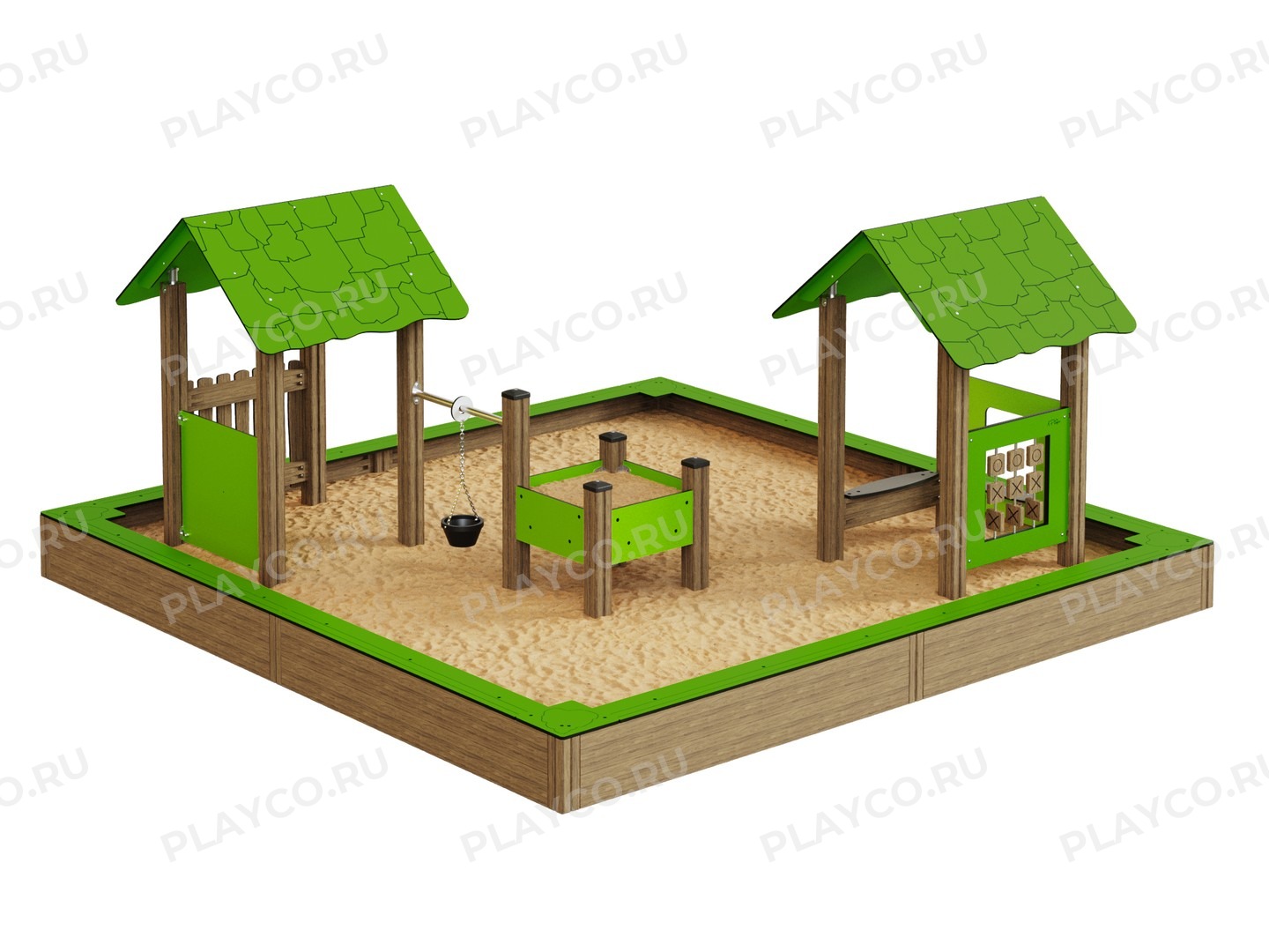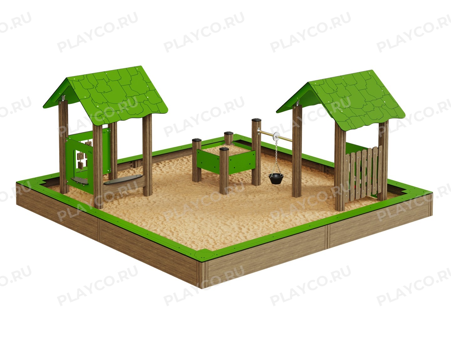 Песочный дворик — это идеальное место для активных игр и развития фантазии малышей. Его конструкция включает два домика и песочницу, предлагая разнообразие развлечений на свежем воздухе. Стильный дизайн и прочные материалы обеспечивают надежность и долговечность.