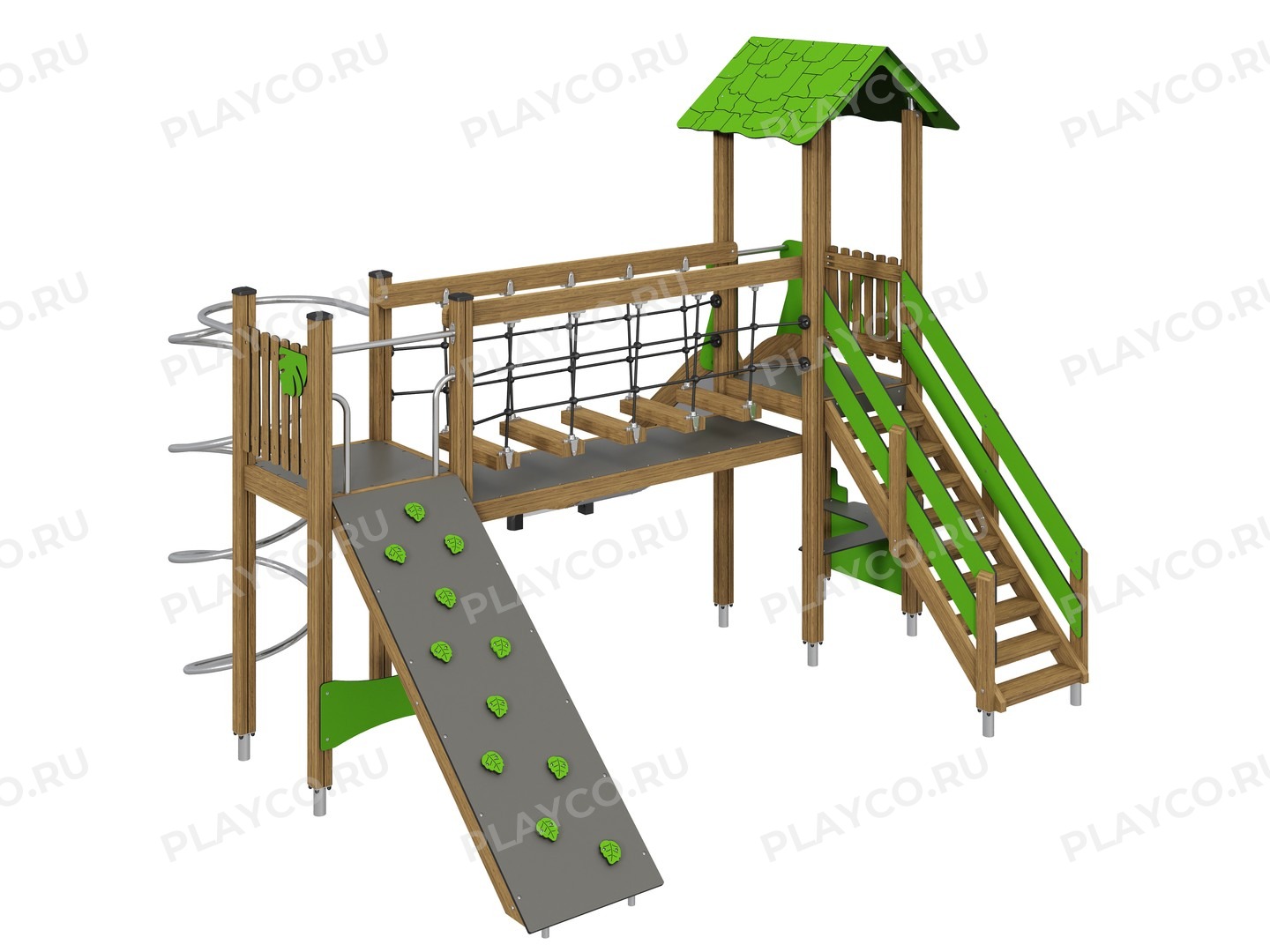 Игровой комплекс серии Jungle Jump предназначен для детей в возрасте от 3 лет. Конструкция выполнена из современных и безопасных материалов: опорные столбы конструкции выполнены из клееного бруса хвойных пород. Для панелей, крыши и ограждения используются HPL – панели толщиной 10 мм. Прямые горки выполнены из нержавеющей стали толщиной 2 мм. Крепежные элементы выполнены из нержавеющей стали толщиной 3-5 мм.