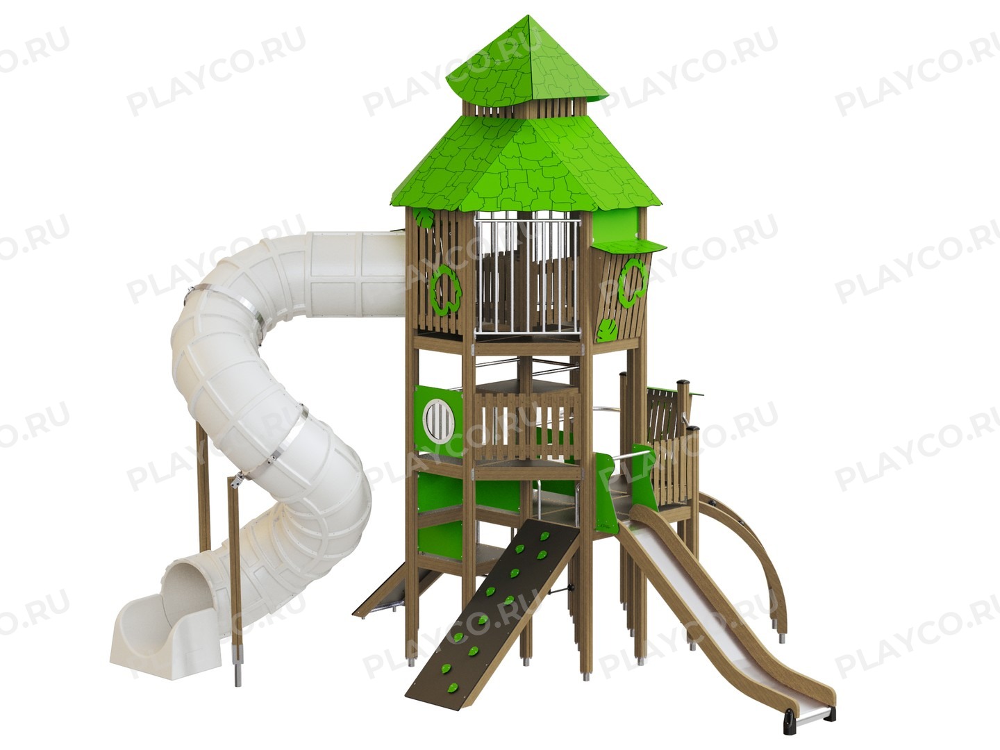 Игровой комплекс серии Jungle Jump предназначен для детей в возрасте от 7 лет. Центральным элементом является высокая многоэтажная деревянная башня, которая имеет открытые смотровые площадки. Важной деталью является большая туннельная горка, спускающаяся с верхнего уровня башни. Конструкция выполнена из качественных и долговечных материалов: клееного бруса и современных HPL-панелей.