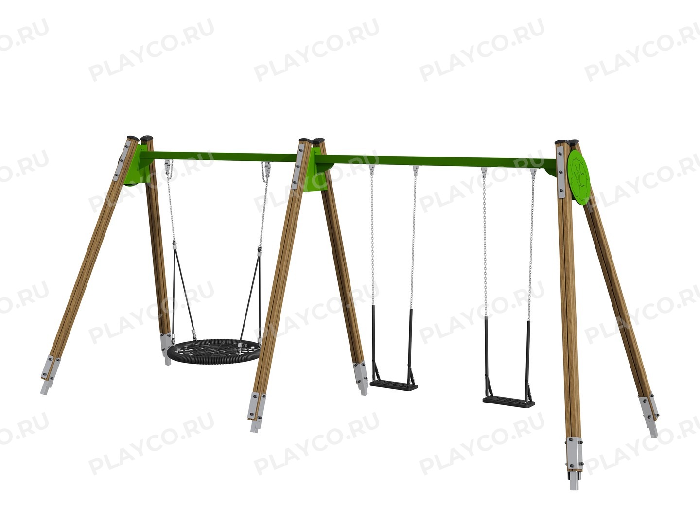 Тройные качели — универсальный элемент для детской площадки, подходящий как для малышей, так и для детей постарше. Отлично вписываются в любой ландшафт и побуждают к играм на свежем воздухе. Конструкция выполнена из клееного бруса в, HPL-панелей и прочных цепей. Несущая балка усилена, опоры с декоративными элементами обеспечивают устойчивость. Качели развивают вестибулярный аппарат, координацию и чувство ритма, позволяют качаться вместе с друзьями или родителями.