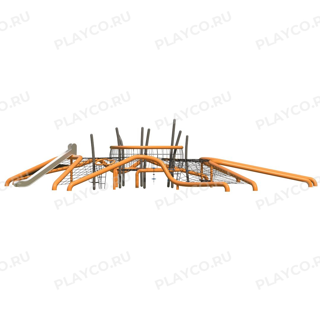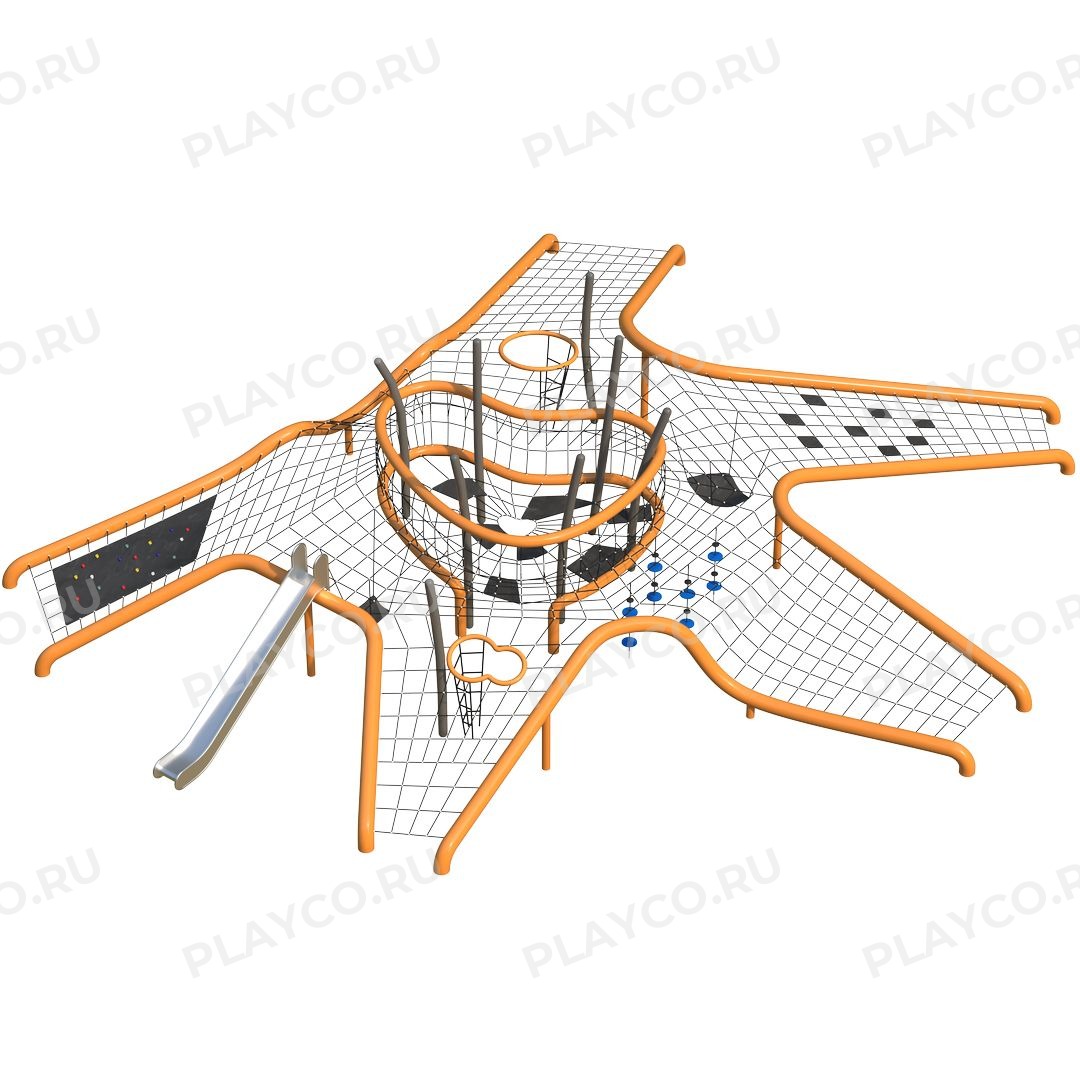 Игровой канатный комплекс серии Spider Two для детей от 7 лет. Конструкция выполнена из прочной металлической основы и армированных канатных сеток. Изогнутый каркас в виде расходящихся «лучей» создает многоуровневое игровое пространство с переменной высотой и наклоном. Это делает лазание более динамичным и сложным — детям приходится постоянно балансировать и адаптироваться к меняющемуся рельефу сетки. Комплекс дополнен горкой, вертикальной башней и элементами скалодрома для максимально разнообразного досуга.