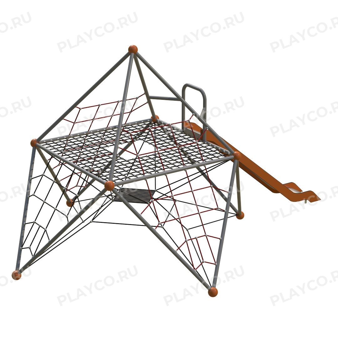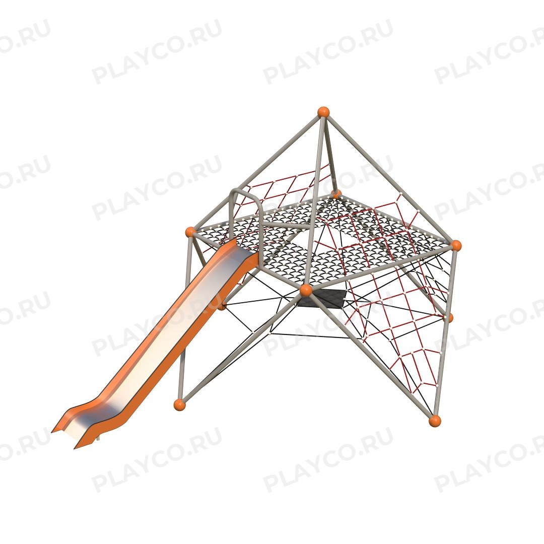 Игровой комплекс из канатной конструкции и горки серии Spider Two для детей от 7 лет. Конструкция выполнена из прочной металлической основы, армированных канатных сеток и скатной поверхности из нержавеющей стали. Сочетает в себе скалодром, зону отдыха на сетке и возможность для веселого спуска.