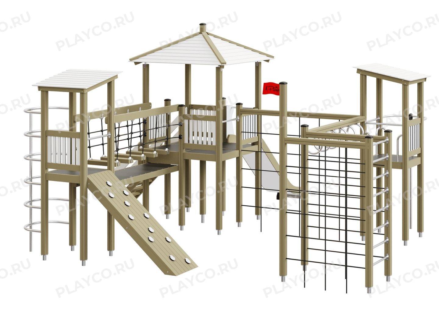 Сказочный лабиринт серии Magic Castle — целый мир приключений для детей от 7 лет. Конструкция выполнена из клееного бруса и прочных HPL-панелей. Включает в себя три башни, канатные конструкции для лазания, трап с эргономичными захватами и горку.