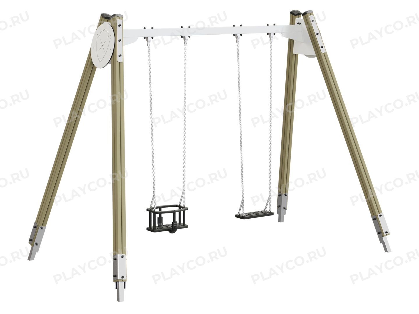 Качели с двумя подвесами серии Magic Castle для детей разных возрастов от 3 до 7 лет. Конструкция выполнена из клееного бруса, HPL-панелей, нержавеющей стали и прочных цепей. Одна сторона оснащена безопасным сиденьем-люлькой для самых маленьких, вторая — классическим плоским сиденьем для самостоятельного качания.