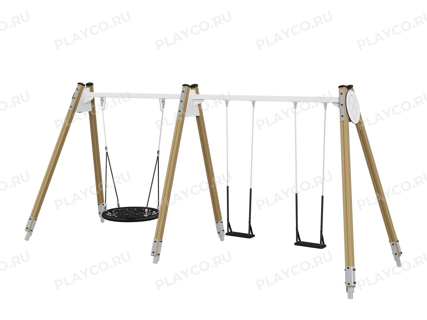 Качели серии Magic Castle предназначены для детей в возрасте от 3 лет. Конструкция выполнена из клееного бруса и HPL-панелей в качестве акцента. Качели оснащены сразу тремя подвесами: большим круглым сиденьем-«гнездом» из плетёных канатов, безопасным сиденьем-люлькой для самых маленьких и классическим плоским сиденьем для самостоятельного качания.