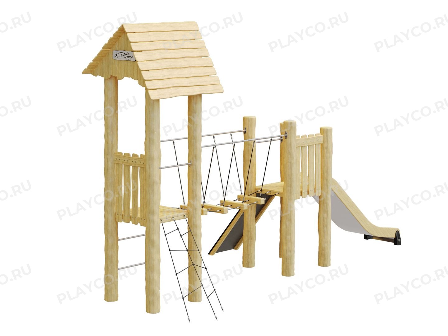 Детский игровой комплекс серии Play Eco предназначен для детей в возрасте от 7 лет. Конструкция выполнена из натуральной древесины (лиственницы, ели или акации на выбор) с естественной текстурой и защитным покрытием.