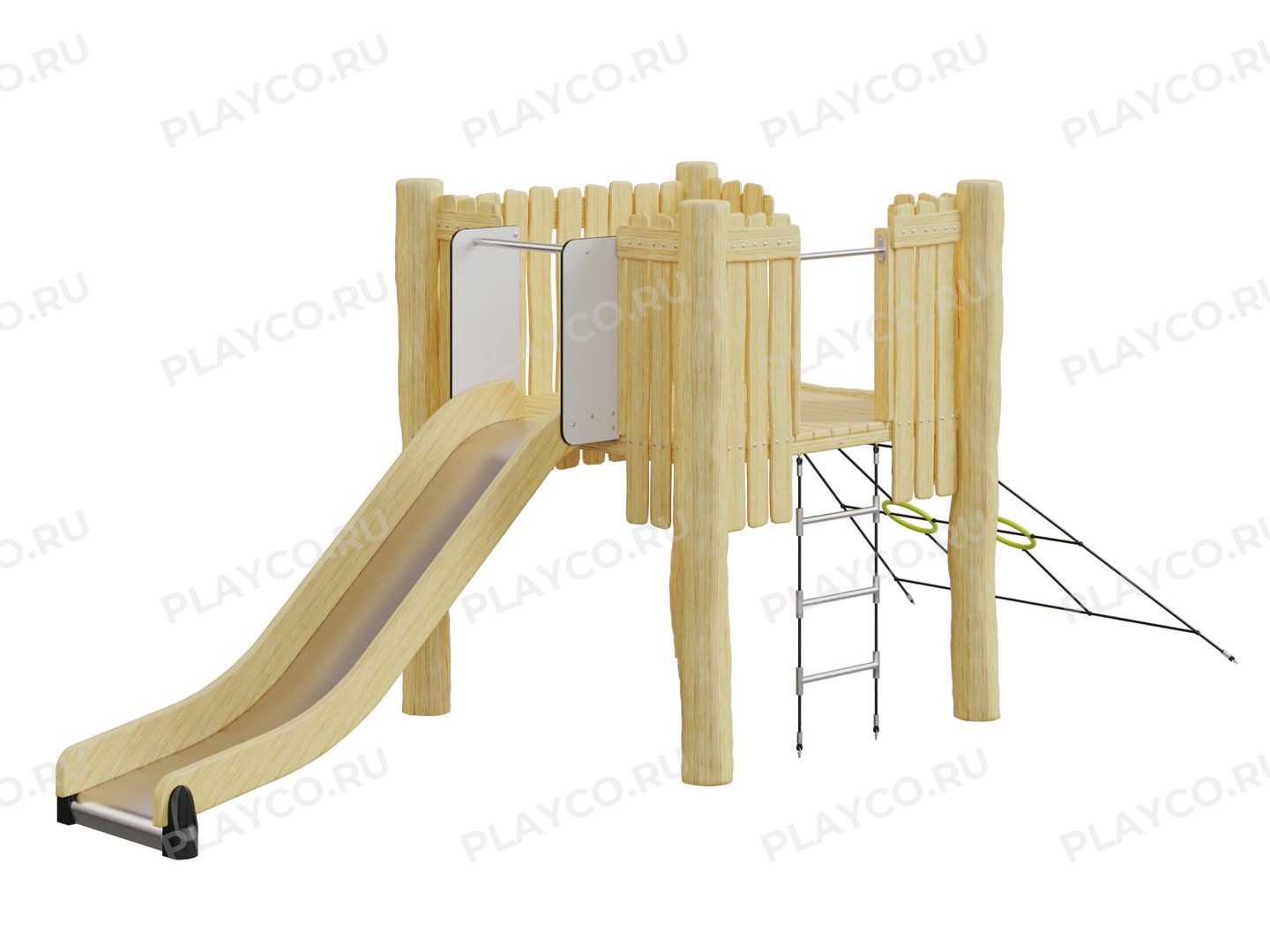 Игровой комплекс серии Play Eco с элементами для лазания предназначен для детей от 7 лет. Конструкция выполнена из натуральной древесины (лиственницы, ели или акации на выбор) с сохранением её естественной текстуры и формы. Модель объединяет классические и спортивные элементы, создавая пространство для активных игр.