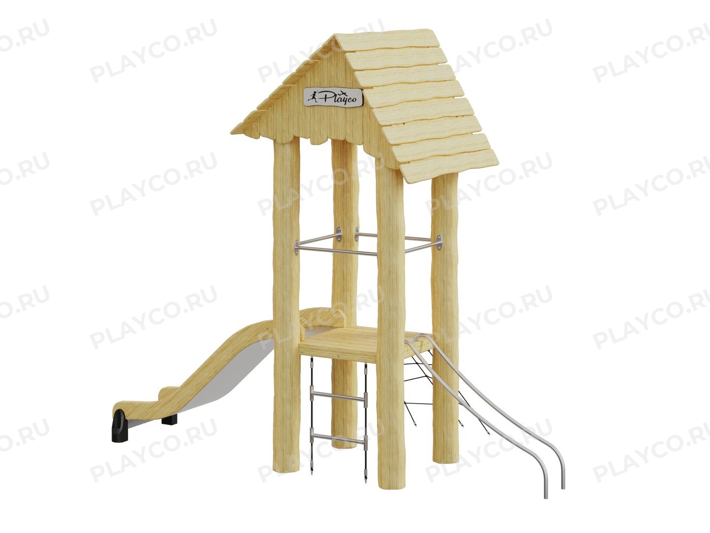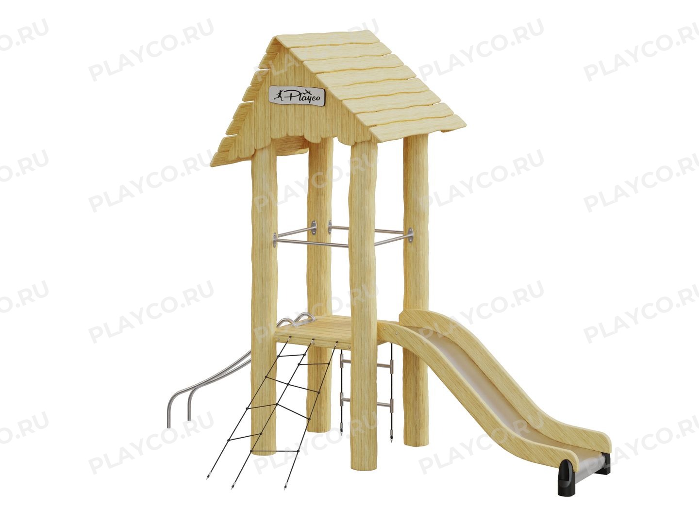 Детский игровой комплекс серии Play Eco для детей от 7 лет. Конструкция выполнена из натуральной древесины (лиственницы, ели или акации на выбор) с сохранением её естественной текстуры и формы. Модель грамотно объединяет в себе классические развлекательные и современные спортивные элементы для всестороннего развития.