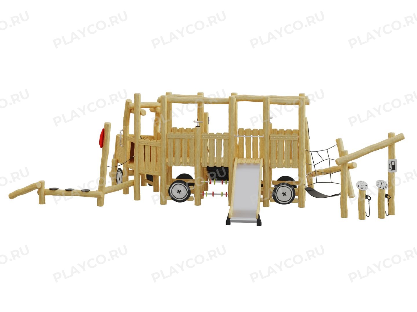 Детский игровой комплекс серии Play Eco для детей от 3 лет, выполненный в форме грузовика из натуральной древесины, идеально подходит для развития воображения и активных игр на свежем воздухе. Конструкция сохраняет естественную текстуру дерева и объединяет в себе реалистичные элементы машины — кабину, колеса и кузов — с безопасными игровыми платформами.
