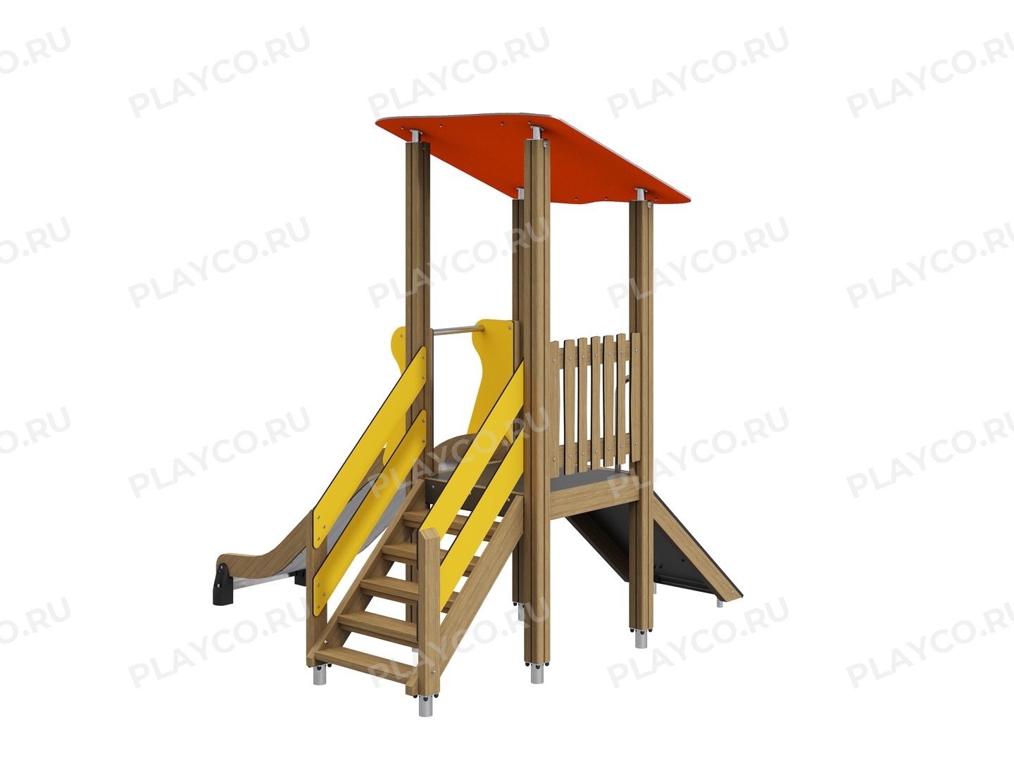 Игровой комплекс серии Safari & Drive — универсальное пространство для игр! Опорные столбы конструкции выполнены из клееного бруса хвойных пород. Для панелей, крыши и ограждения используются HPL – панели толщиной 10 мм. Прямая горка выполнена из нержавеющей стали толщиной 2 мм. Наклонный трап с зацепами способствует развитию мелкой моторики и координации ребенка. Крепежные элементы выполнены из нержавеющей стали толщиной 3-5 мм.