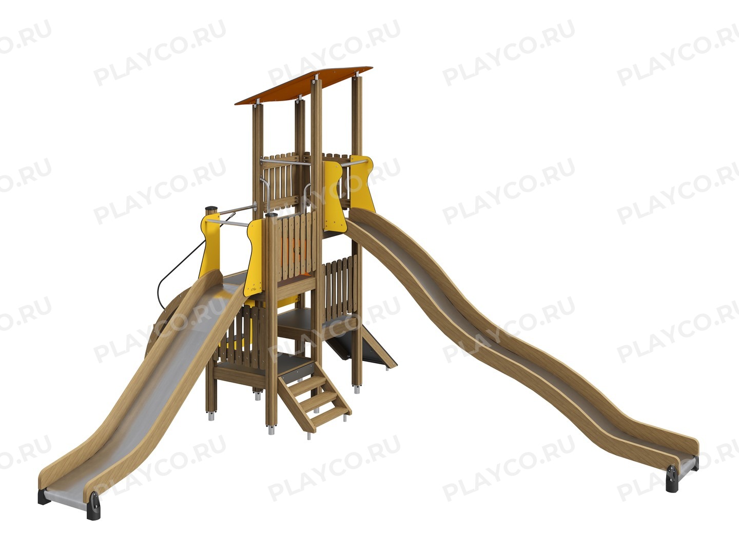 Игровой комплекс серии Safari & Drive предназначен для детей в возрасте от 3 лет. Конструкция выполнена из современных и безопасных материалов: опорные столбы конструкции выполнены из клееного бруса хвойных пород. Для панелей, крыши и ограждения используются HPL – панели толщиной 10 мм. Прямые горки выполнены из нержавеющей стали толщиной 2 мм. Крепежные элементы выполнены из нержавеющей стали толщиной 3-5 мм.
