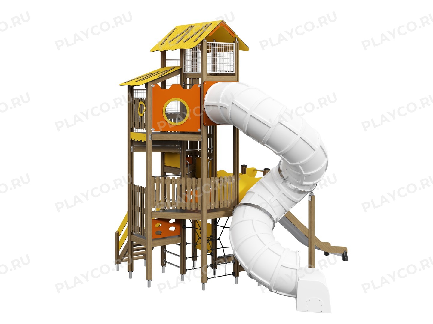 Конструкция состоит из клееного бруса, HPL-панелей и элементов крепления из нержавеющей стали. Закрытая спиральная горка-туннель сделана из качественного LLDPE-пластика.