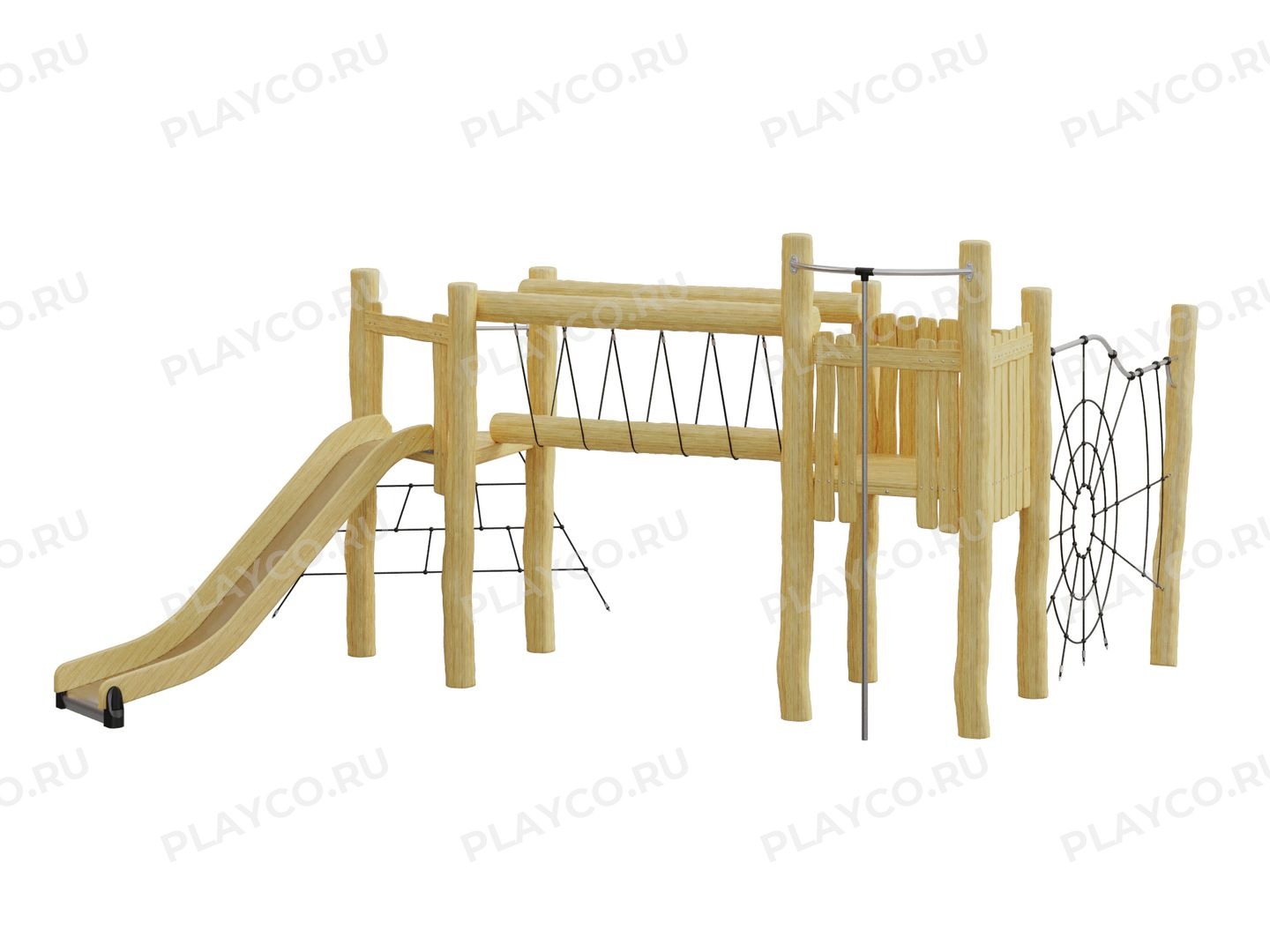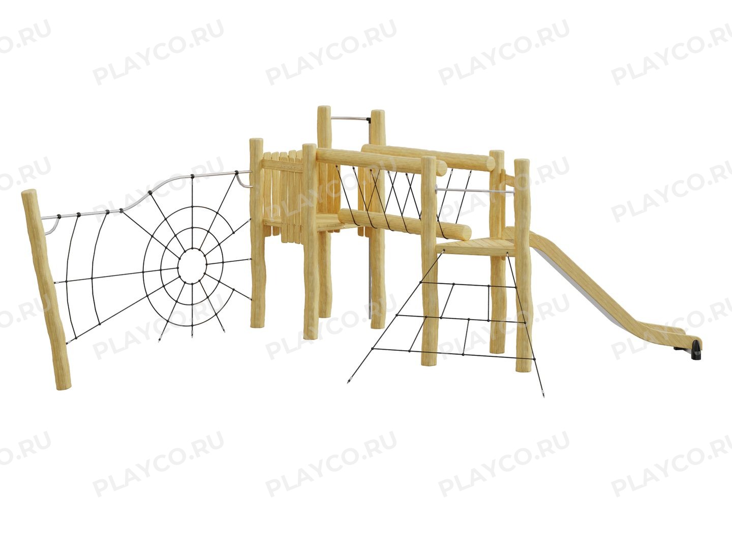 Игровой комплекс в стиле «Эко» серии Spider Two для детей от 7 лет. Модель выполнена из натурального фактурного дерева, армированных канатов и нержавеющей стали. Сочетает в себе масштабную канатную «паутину», подвесной мостик и горку для веселого спуска.