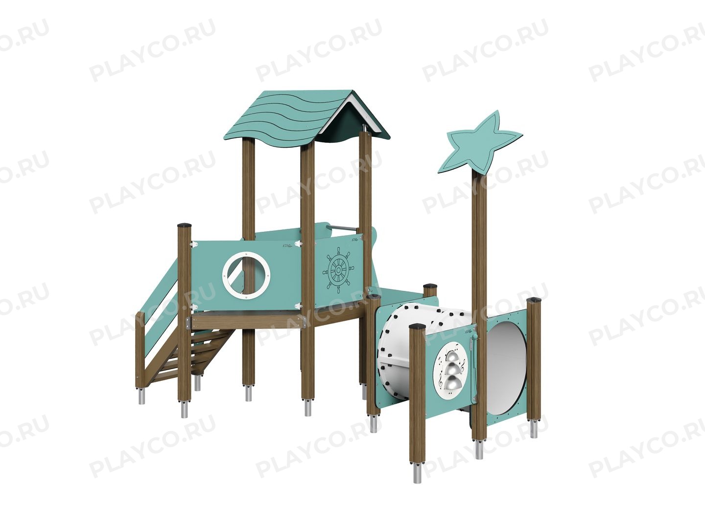Детский игровой комплекс серии Sea Battle предназначен для детей в возрасте от 3 лет. Конструкция сочетает в себе современные и качественные материалы: клеёный брус из древесины хвойных пород, нержавеющую сталь и HPL-панели, что обеспечивает безопасность, долговечность и эстетичный вид. Игровой комплекс оснащён крышей, которая надёжно защищает детей от дождя и солнца, музыкальной игровой панелью, пластиковым тоннелем и горкой.