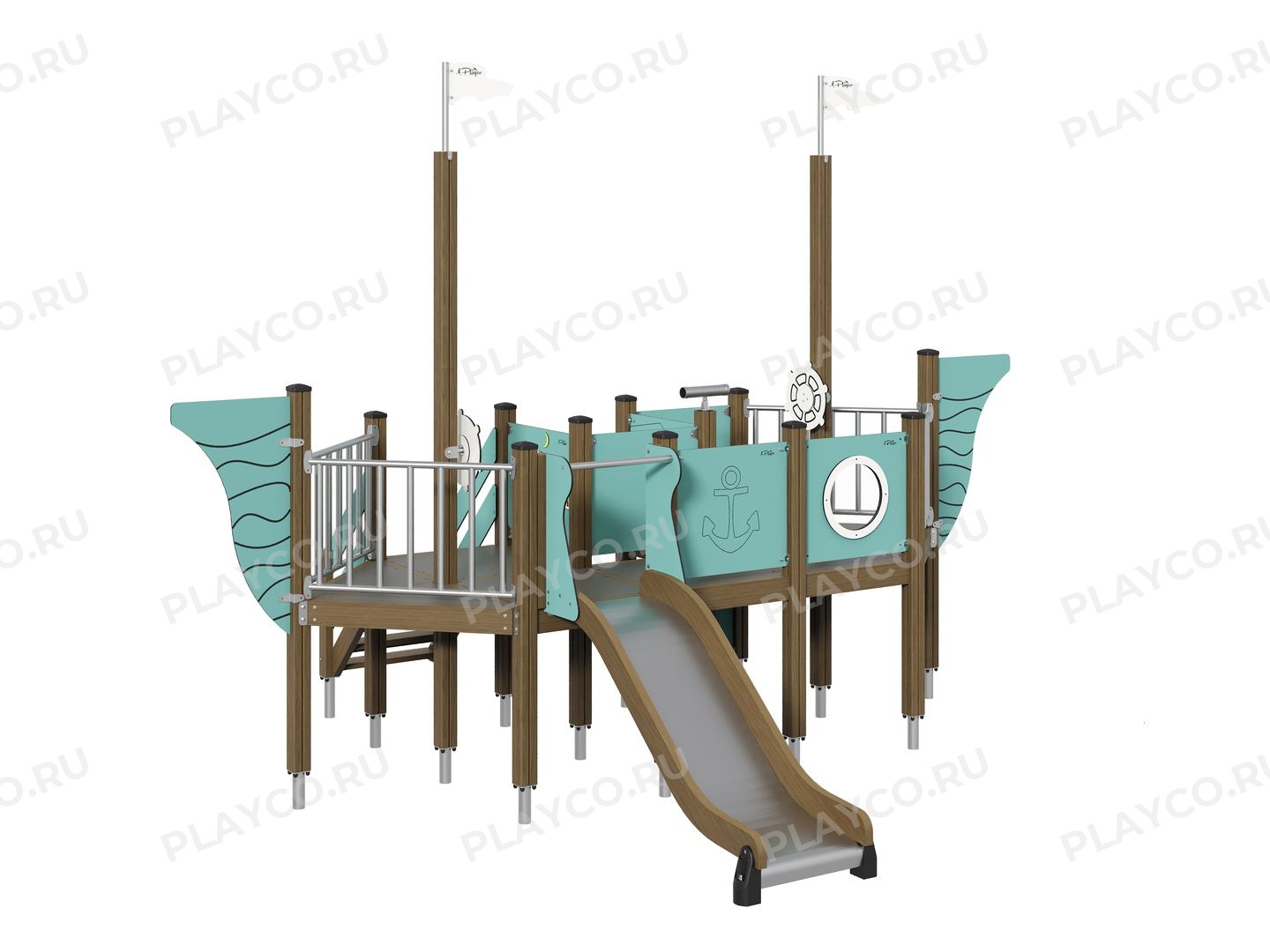 Игровой комплекс серии Sea Battle в виде маленького корабля предназначен для детей в возрасте от 7 лет. Конструкция сочетает в себе современные и качественные материалы: клеёный брус из древесины хвойных пород, нержавеющую сталь и HPL-панели, что обеспечивает безопасность, долговечность и эстетичный вид. Комплекс включает в себя две игровые панели, горки и даже штурвал.