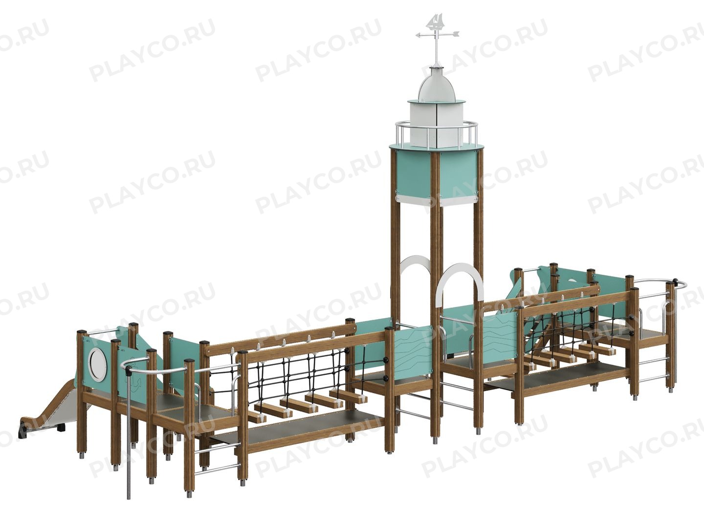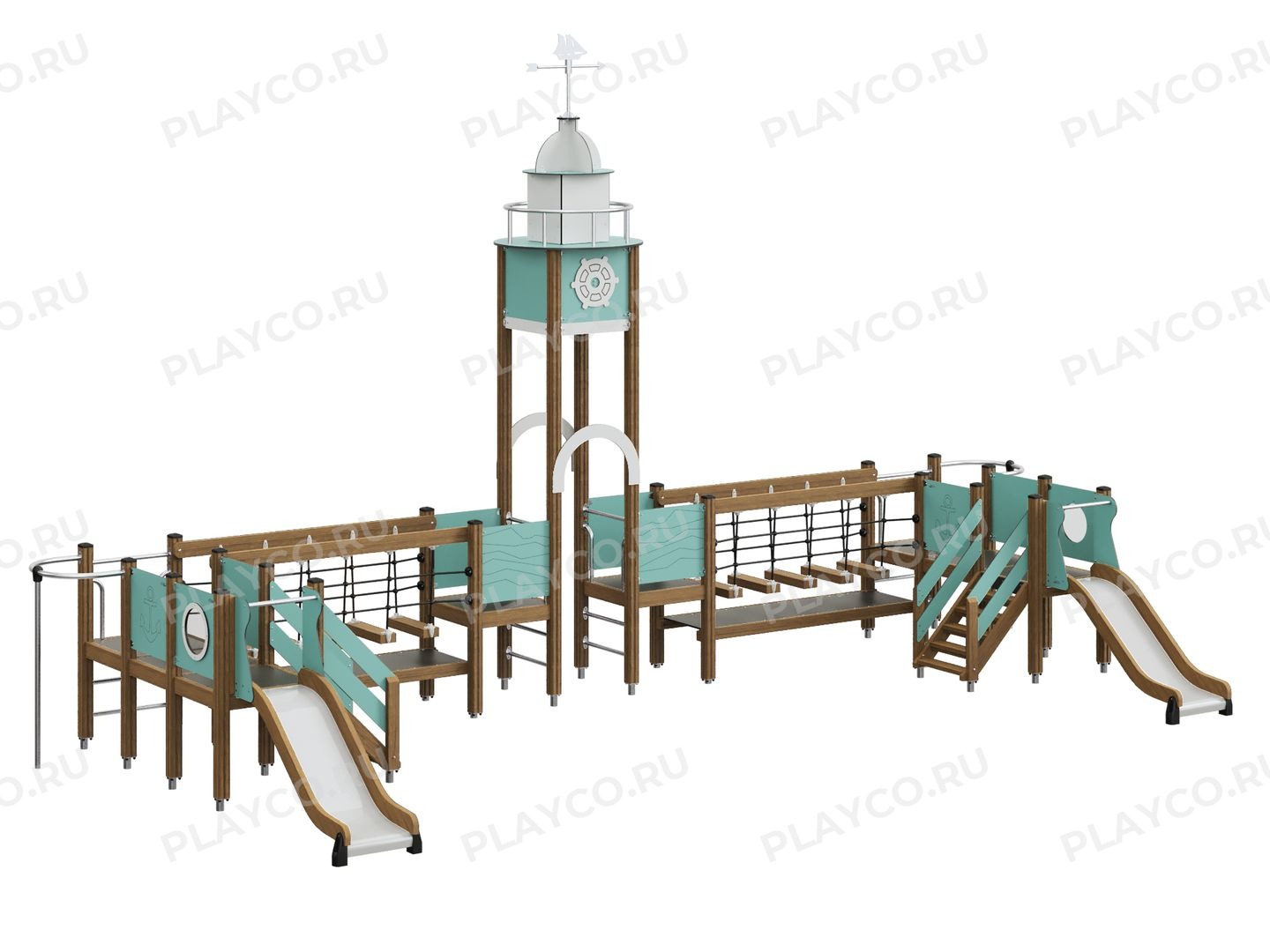 Игровой комплекс серии Sea Battle в виде настоящего маяка не оставит равнодушным ни одного любителя приключений. Комплекс предназначен для детей в возрасте от 7 лет. Конструкция выполнена из клеёного бруса, нержавеющих креплений и прочных HPL-панелей в натуральных древесных тонах с яркими акцентами. В комплексе есть горка из листа нержавеющей стали, подвесной мост для развития ловкости и даже лодочная станция.