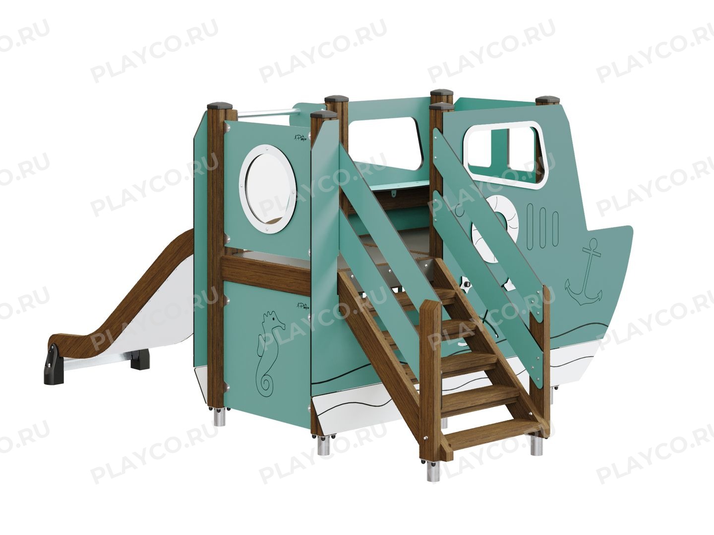 Игровой комплекс серии Sea Battle, выполненный в виде катера, предназначен для самых маленьких детей — от 3 лет. Конструкция изготовлена из влагостойких HPL-панелей и клеёного бруса. Зонтик защищает от дождя и солнца, лаз с зацепами способствует развитию ловкости, а горка из листового металла дарит радость быстрого и безопасного спуска.