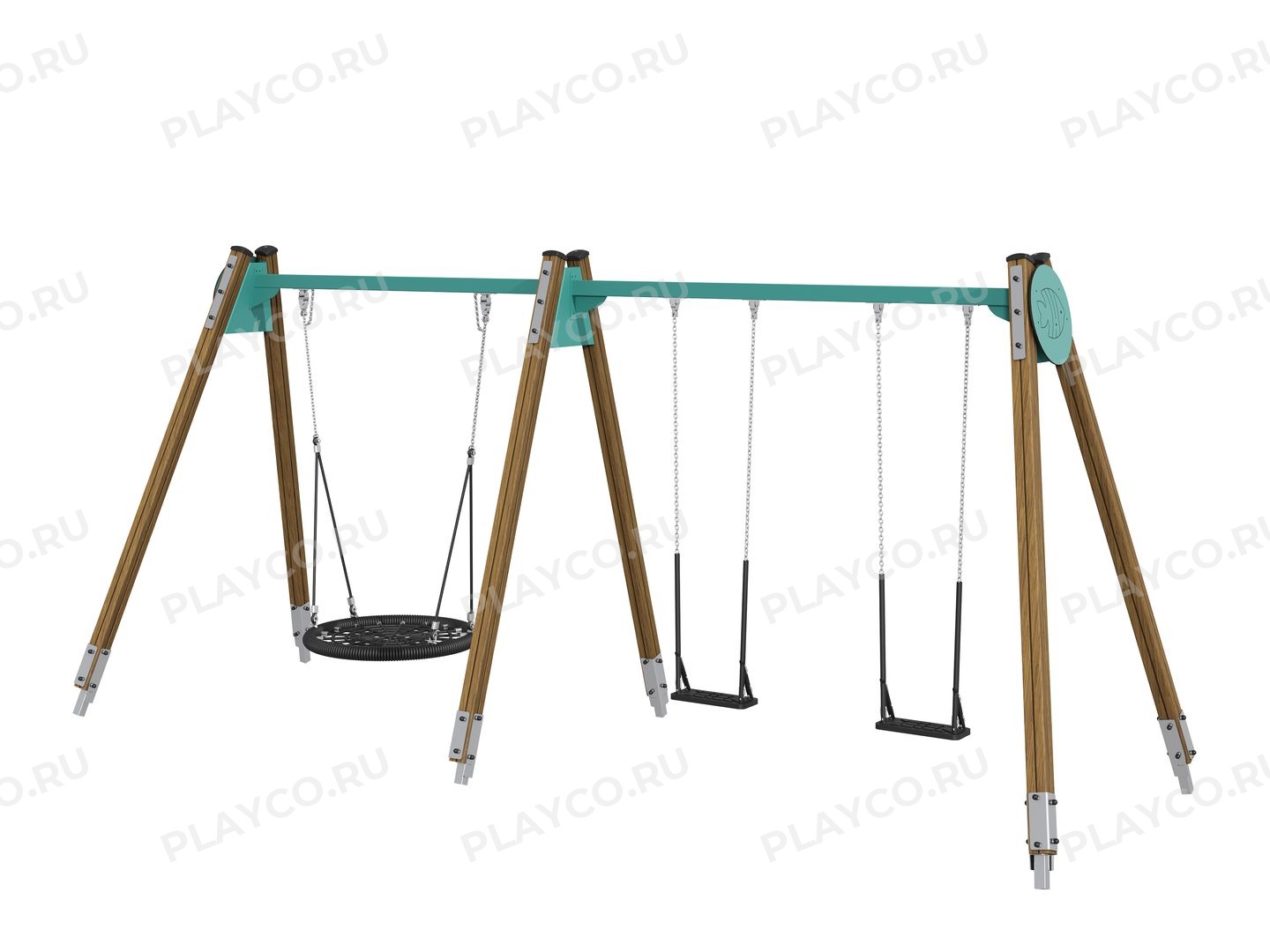 Качели серии Sea Battle предназначены для детей в возрасте от 3 лет. Конструкция выполнена из клееного бруса и HPL-панелей в качестве акцента. Качели оснащены сразу тремя подвесами: большим круглым сиденьем-«гнездом» из плетёных канатов, безопасным сиденьем-люлькой для самых маленьких и классическим плоским сиденьем для самостоятельного качания.