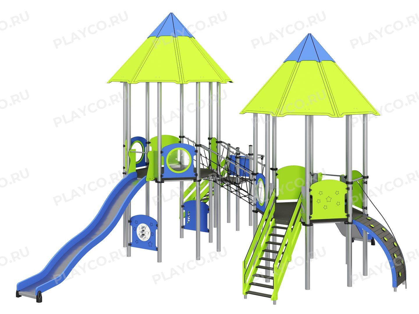 большой двухбашенный игровой комплекс серии Sky Fly для детей от 7 лет. Констукция выполнена из нержавеющей стали и прочных HPL-панелей. Под одной из башен расположена тематическая игровой домик с декоративными панелями и «окошками», что идеально подходит для сюжетно-ролевых игр в тени.