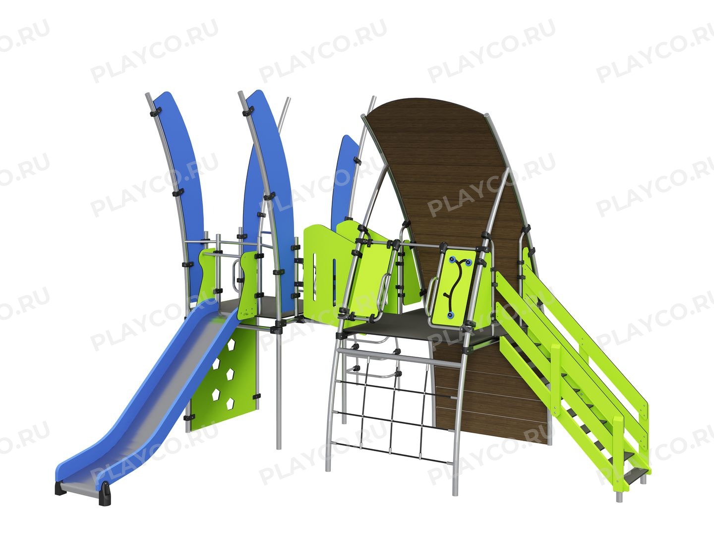 Игровой комплекс серии Sky Fly для детей от 7 лет представляет собой настоящую «полосу препятствий», ориентированную на активное физическое развитие и тренировку ловкости. Конструкция выполнена из нержавеющей стали, прочных HPL-панелей и клееного бруса. В отличие от башенных моделей, здесь сделан акцент на разнообразие способов подъёма и динамику.