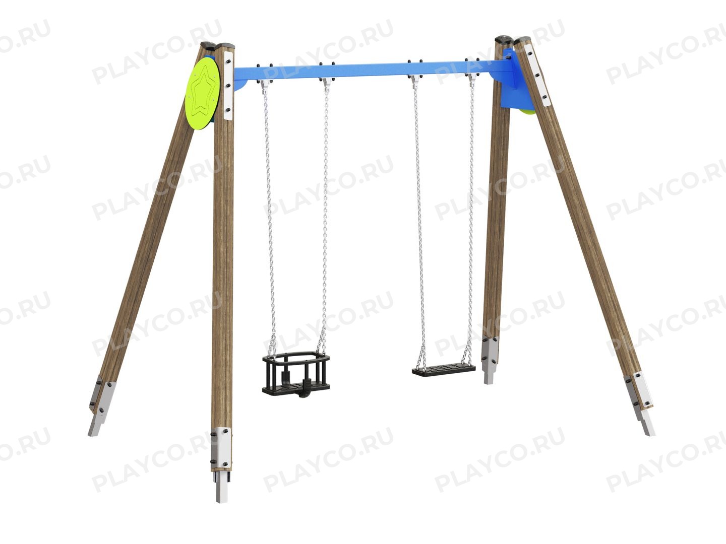 Качели с двумя подвесами серии Sky Flyдля детей разных возрастов от 3 до 7 лет. Конструкция выполнена из клееного бруса, HPL-панелей, нержавеющей стали и прочных цепей. Одна сторона оснащена безопасным сиденьем-люлькой для самых маленьких, вторая — классическим плоским сиденьем для самостоятельного качания.