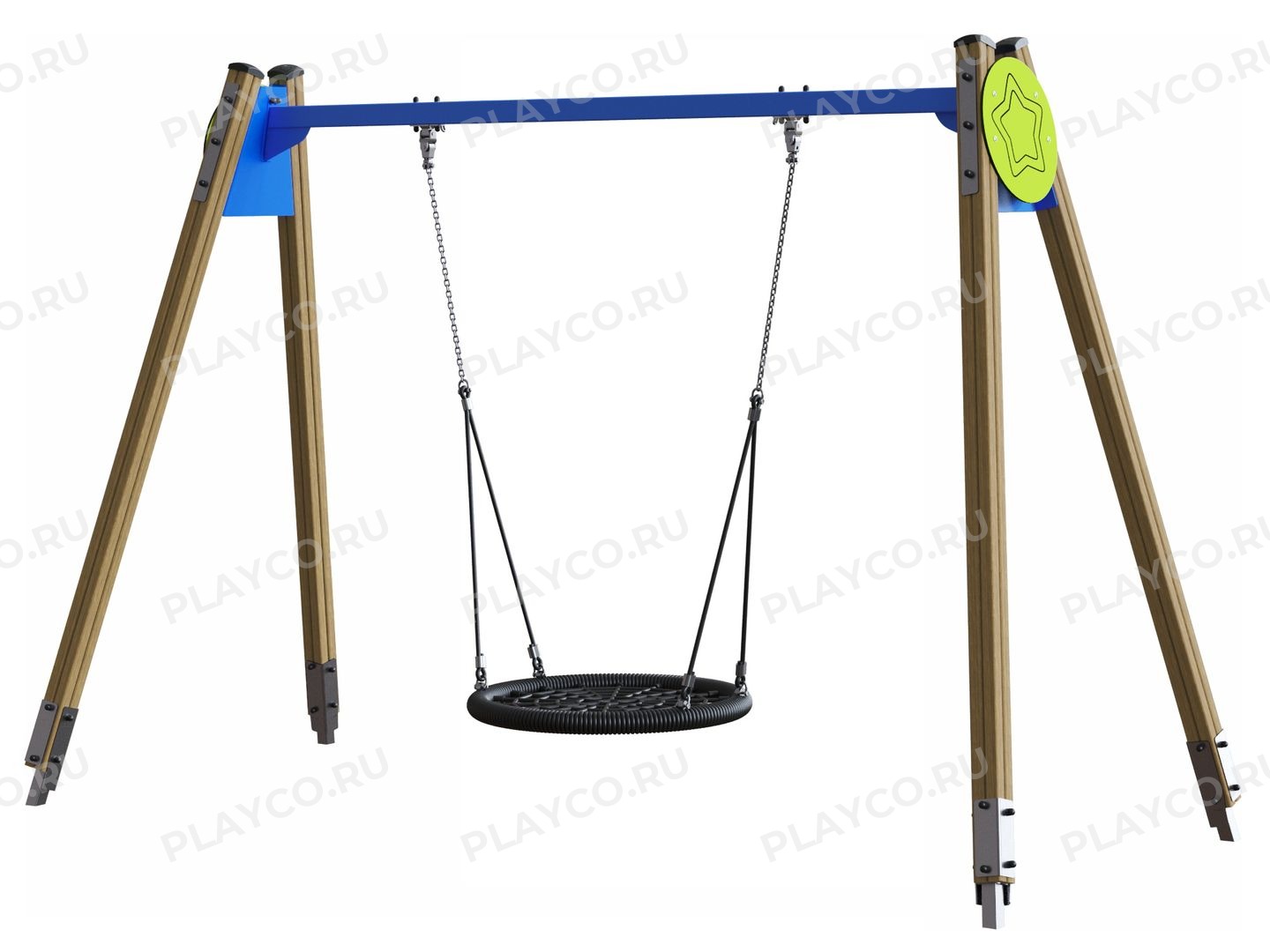 Качели – гнездо серии Sky Flyпредназначен для детей в возрасте от 3 лет. Конструкция выполнена из клееного бруса и HPL-панелей в качестве акцента. Большое круглое сиденье "гнездо" из плетёных канатов обеспечивает удобное положение и безопасность во время игры.